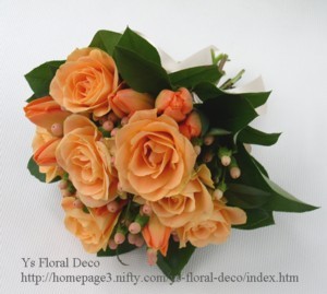 使用花材 バラ(ボナンザ) チューリップ(オレンジエンペラー) ヒペリカム(シュガーフレア) レモンリーフ (06.2作成)